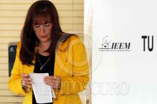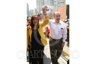 NAUCALPAN, ESTADO DE MEXICO 03JULIO2005.- La candidata por la alianza PRD-PT Yeidckol Polevnsky sale de la casilla 2699 en la colonia Lomas de Tecamachalco junto al presidente nacional del PRD Leonel Cota. FOTO: Miguel Dimayuga/CUARTOSCURO.COM