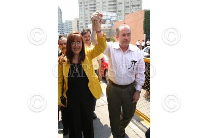 NAUCALPAN, ESTADO DE MEXICO 03JULIO2005.- La candidata por la alianza PRD-PT Yeidckol Polevnsky sale de la casilla 2699 en la colonia Lomas de Tecamachalco junto al presidente nacional del PRD Leonel Cota. FOTO: Miguel Dimayuga/CUARTOSCURO.COM