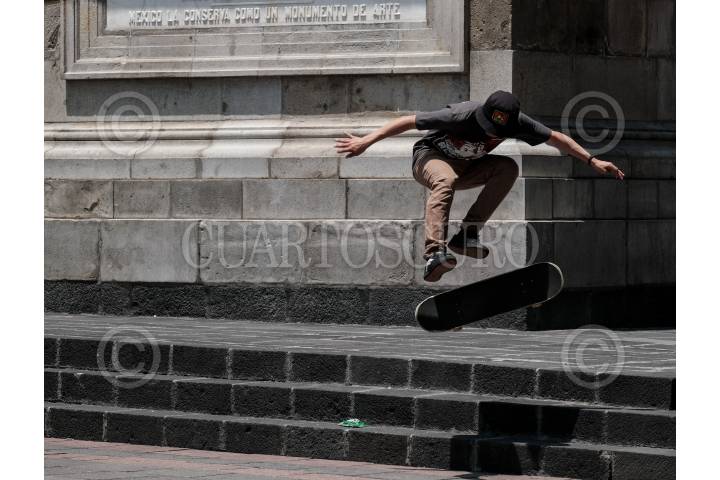 CIUDAD DE MÉXICO, 13AGOSTO2019.- Un joven practica trucos de skateboarding en las calles del Centro Histórico. FOTO: GRACIELA LÓPEZ /CUARTOSCURO.COM