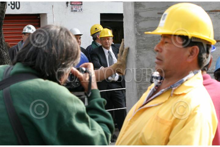 MEXICO, DF 19JULIO2005.- Ruth Zabaleta delegada de Venustiano Carranza y el jefe de gobierno Andrés Manuel López Obrador escuchan la explicación técnica del secretario de obras públicas Cesar Buenrostro durante la supervisión de la construcción de la segunda fase de los ejes viales en la avenida Oceania. FOTO: Miguel Dimayuga/CUARTOSCURO.COM