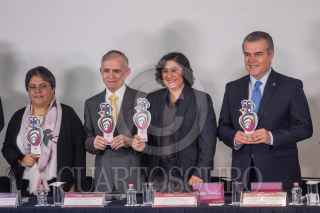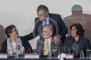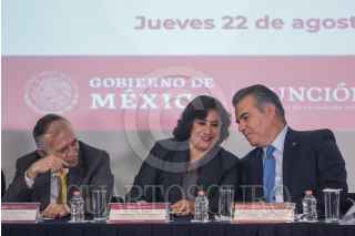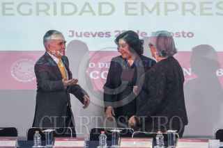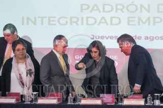 CIUDAD DE MÉXICO, 22AGOSTO2019.- La oficial Mayor Raquel Buenrostro Sánchez, Alfonso Romo Garza, jefe de la oficina de la Presidencia, Irma Eréndira Sandoval, secretaria de la Función Pública, y Francisco Cervantes Díaz, presidente de Concamin, durante la presentación del Padrón de Integridad Empresarial, con el cual se busca incentivar y reconocer a las empresas que lleven a cabo prácticas de honestidad y transparencia. FOTO: ISAAC ESQUIVEL /CUARTOSCURO.COM