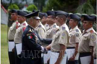 CUERNAVACA, MORELOS, 23AGOSTO2019. Ceremonia de Imposición de Distinciones de Desempeño a soldados por su trabajo en el Plan DNIII-E, operaciones y adiestramiento en la XXIV Zona Militar. El comandante de la zona, Agustín Vallejo, acompañado de generales de regimientos presidio la entrega. FOTO: MARGARITO PÉREZ RETANA /CUARTOSCURO.COM
