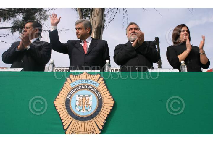 MEXICO, D.F. 21JULIO2005.- Jesús Zambrano, subsecretario de Gobierno, Joel Ortega, titular de la SSP-DF, Andrés Manuel López Obrador, jefe de Gobierno capitalino y Alejandro Encinas durante el abanderamiento de la escolta, durante la ceremonia de ascensos a policías. FOTO: Sandra Perdomo/CUARTOSCURO.COM