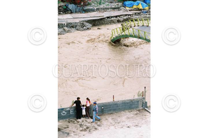 MONTERREY, NUEVO LEON21JULIO2005.- Pese a las advertencias de las autoridades varios comerciantes del mercado popular ¨La Pulga, dejaron algunas de sus pertencias que anoche el caudal del Río Santa Catarina se encargo de llevarse, al fondo un puente peatonal averiado también. FOTO: Pedro Valtierra/CUARTOSCURO.COM