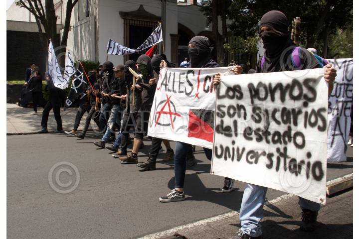 CIUDAD DE MÉXICO, 03SEPTIEMBRE2019.- La tarde de este martes se realizó una marcha del Parque la Bombilla a Ciudad Universitaria, esto con motivo del ataque porril a la Rectoría del pasado 2018. Decenas de encapuchados protestaron realizando pintas, disturbios en las islas y en la torre de la institución. FOTO: ROGELIO MORALES /CUARTOSCURO.COM