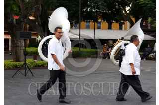 CUERNAVACA, MORELOS, 06SEPTIEMBRE2019.- Dos músicos con una tuba caminan por la plaza de armas de la capital. FOTO: MARGARITO PÉREZ RETANA /CUARTOSCURO.COM