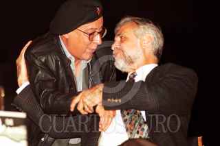 Raúl Jardón y Enrique Sémo; sobrevivientes de la matanza del 2 de octubre de 1968 se abrazan durante la mesa redonda sobre éste tema en la Facultad de Ciencias Políticas de la UNAM. FOTO: Pedro Mera/CUARTOSCURO