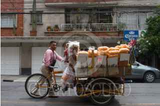 CIUDAD DE MÉXICO, 12SEPTIEMBRE2019.- Hombre empuja un triciclo cargado de botanas y papas fritas por las calles de la Colonia Roma. FOTO: ROGELIO MORALES /CUARTOSCURO.COM