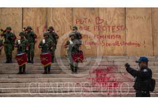 CIUDAD DE MÉXICO, 12SEPTIEMBRE2019.- Un policía toma fotografía durante evento protocolario en el Ángel de la Independencia, el cual se mantiene cerrado por restauración luego de daños durante manifestación feminista. FOTO: ANDREA MURCIA /CUARTOSCURO.COM