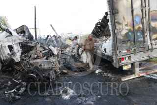 CENTLA, TABASCO, 12SEPTIEMBRE2019.- Dos tráileres colisionaron de frente y se incendiaron sobre la carretera Villahermosa-Frontera; tras el trágico percance en el que ambos conductores murieron. De la misma manera autoridades de la Policía Estatal informaron que automovilistas y habitantes cercanos a la zona del accidente, rapiñaron la carne de cerdo y res que era transportada en una de las unidades siniestradas, elementos de la Fiscalía General del Estado dieron fe de los hechos sobre el kilometro 38+200 de la carretera federal Villahermosa-Frontera. FOTO: EDGAR JASSO /CUARTOSCURO.COM