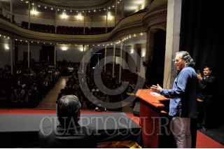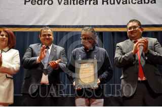 ZACATECAS, ZACATECAS, 12SEPTIEMBRE2019.- El fotoperiodista Pedro Valtierra Ruvalcaba fue galardonado con la máxima distinción que otorga la Universidad Autónoma de Zacatecas el Doctorado Honoris Causa, el cual es concedido a personajes distinguidos por su trayectoria profesional. En esta ocasión la distinción recayó en el fresnillense por su destacada trayectoria internacional, como fotoperiodista, artista de la lente y corresponsal en numerosos conflictos bélicos en América Latina y África. El Doctorado Honoris Causa reconoce la trayectoria de Valtierra que lo ha hecho merecedor de innumerables reconocimientos entre otros el premio Rey de España a la mejor fotografía noticiosa internacional en 1998; y en 2016 la Medalla al Mérito en Artes en la categoría de artes visuales que otorga la Asamblea Legislativa de la Ciudad de México. En su currículum hay más de 350 exposiciones en México y diversos países como Rusia, Argentina, Estados Unidos, Inglaterra, Canadá, Cuba, España, Francia, Italia, Alemania, Bélgica, Venezuela, Ecuador, Guatemala y Costa Rica; así como innumerables concursos nacionales e internacionales de los que ha sido jurado. Entregaron el reconocimiento el rector de la UAZ, Antonio Guzmán Fernández, y el secretario general de la UAZ, Ruben de Jesús Ibarra. FOTO: CARLOS SEGURA /CUARTOSCURO.COM
