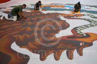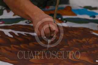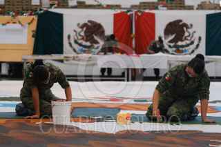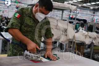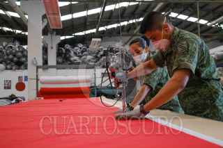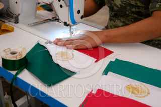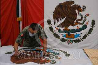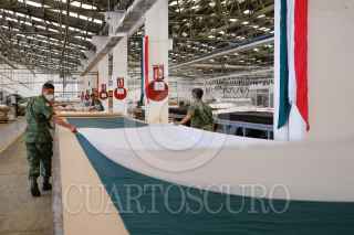 CIUDAD DE MÉXICO, 13SEPTIEMBRE2019.- Elementos de la Secretaria de la Defensa Nacional (SEDENA), elaboran banderas monumentales, de edifico y escritorio a través de la Dirección General de la Fábrica de Vestuario y Equipo (FAVE). Las telas son de nylon y hechas en la misma fábrica. El tiempo que se estima para su elaboración es de aproximadamente un mes. El proceso de elaboración se divide en varias etapas, en las que se maneja el Tejido, en dónde se adhieren los colorantes; el Teñido, en el que se adicionan los colores a 110º, con productos químicos como el teflón que son resistentes a la humedad; el Enjuague y Secado, y el Acabado, en el que realizan la revisión de metro por metro. En la etapa del Trazo y Corte, se requieren diferentes metros de tela y se necesita una tabla de dimensiones para conocer cuántos lienzos se cortan para cada color. Después se confeccionan y posteriormente pintan a mano el Escudo Nacional por ambos lados en el que se ocupan 11 colores básicos y 5 para matizar; los colorantes textiles son repelentes y a base de agua. Las banderas de edificio miden de 50 metros hacia arriba y las monumentales miden hasta 120 metros de largo en el asta, el peso de una bandera de 50 metros pesa alrededor de 230 kilogramos y su costo es aproximadamente de 300 mil pesos. Cuando una bandera monumental es rasgada por el viento, elementos del Ejército Mexicano la destruyen mediante un proceso de incineración, rindiendo honores en una ceremonia y la cambian por una nueva. La bandera monumental más grande del país se encuentra en la explanada del puente Internacional I Solidaridad de Piedras Negras, Coahuila; mide 60 metros por 34 y pesa 300 kilogramos; el asta tiene una altura de 120 metros, la cual está fabricada con acero de alta resistencia y pesa 160 toneladas que soportan vientos de hasta 190 kilómetros por hora. FOTO: GRACIELA LÓPEZ /CUARTOSCURO.COM