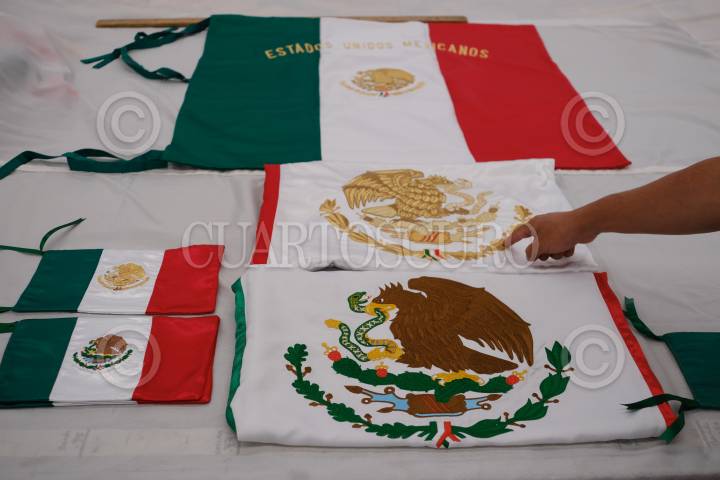 CIUDAD DE MÉXICO, 13SEPTIEMBRE2019.- Elementos de la Secretaria de la Defensa Nacional (SEDENA), elaboran banderas monumentales, de edifico y escritorio a través de la Dirección General de la Fábrica de Vestuario y Equipo (FAVE). Las telas son de nylon y hechas en la misma fábrica. El tiempo que se estima para su elaboración es de aproximadamente un mes. El proceso de elaboración se divide en varias etapas, en las que se maneja el Tejido, en dónde se adhieren los colorantes; el Teñido, en el que se adicionan los colores a 110º, con productos químicos como el teflón que son resistentes a la humedad; el Enjuague y Secado, y el Acabado, en el que realizan la revisión de metro por metro. En la etapa del Trazo y Corte, se requieren diferentes metros de tela y se necesita una tabla de dimensiones para conocer cuántos lienzos se cortan para cada color. Después se confeccionan y posteriormente pintan a mano el Escudo Nacional por ambos lados en el que se ocupan 11 colores básicos y 5 para matizar; los colorantes textiles son repelentes y a base de agua. Las banderas de edificio miden de 50 metros hacia arriba y las monumentales miden hasta 120 metros de largo en el asta, el peso de una bandera de 50 metros pesa alrededor de 230 kilogramos y su costo es aproximadamente de 300 mil pesos. Cuando una bandera monumental es rasgada por el viento, elementos del Ejército Mexicano la destruyen mediante un proceso de incineración, rindiendo honores en una ceremonia y la cambian por una nueva. La bandera monumental más grande del país se encuentra en la explanada del puente Internacional I Solidaridad de Piedras Negras, Coahuila; mide 60 metros por 34 y pesa 300 kilogramos; el asta tiene una altura de 120 metros, la cual está fabricada con acero de alta resistencia y pesa 160 toneladas que soportan vientos de hasta 190 kilómetros por hora. FOTO: GRACIELA LÓPEZ /CUARTOSCURO.COM