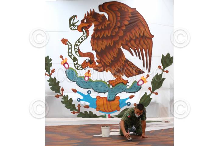 CIUDAD DE MÉXICO, 13SEPTIEMBRE2019.- Elementos de la Secretaria de la Defensa Nacional (SEDENA), elaboran banderas monumentales, de edifico y escritorio a través de la Dirección General de la Fábrica de Vestuario y Equipo (FAVE). Las telas son de nylon y hechas en la misma fábrica. El tiempo que se estima para su elaboración es de aproximadamente un mes. El proceso de elaboración se divide en varias etapas, en las que se maneja el Tejido, en dónde se adhieren los colorantes; el Teñido, en el que se adicionan los colores a 110º, con productos químicos como el teflón que son resistentes a la humedad; el Enjuague y Secado, y el Acabado, en el que realizan la revisión de metro por metro. En la etapa del Trazo y Corte, se requieren diferentes metros de tela y se necesita una tabla de dimensiones para conocer cuántos lienzos se cortan para cada color. Después se confeccionan y posteriormente pintan a mano el Escudo Nacional por ambos lados en el que se ocupan 11 colores básicos y 5 para matizar; los colorantes textiles son repelentes y a base de agua. Las banderas de edificio miden de 50 metros hacia arriba y las monumentales miden hasta 120 metros de largo en el asta, el peso de una bandera de 50 metros pesa alrededor de 230 kilogramos y su costo es aproximadamente de 300 mil pesos. Cuando una bandera monumental es rasgada por el viento, elementos del Ejército Mexicano la destruyen mediante un proceso de incineración, rindiendo honores en una ceremonia y la cambian por una nueva. La bandera monumental más grande del país se encuentra en la explanada del puente Internacional I Solidaridad de Piedras Negras, Coahuila; mide 60 metros por 34 y pesa 300 kilogramos; el asta tiene una altura de 120 metros, la cual está fabricada con acero de alta resistencia y pesa 160 toneladas que soportan vientos de hasta 190 kilómetros por hora. FOTO: GRACIELA LÓPEZ /CUARTOSCURO.COM