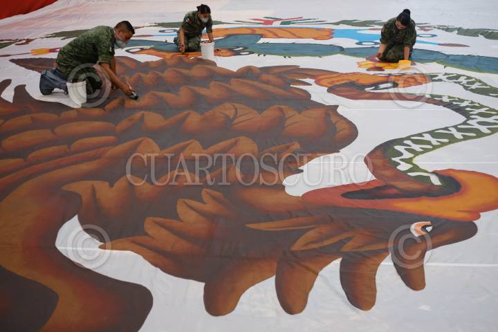 CIUDAD DE MÉXICO, 13SEPTIEMBRE2019.- Elementos de la Secretaria de la Defensa Nacional (SEDENA), elaboran banderas monumentales, de edifico y escritorio a través de la Dirección General de la Fábrica de Vestuario y Equipo (FAVE). Las telas son de nylon y hechas en la misma fábrica. El tiempo que se estima para su elaboración es de aproximadamente un mes. El proceso de elaboración se divide en varias etapas, en las que se maneja el Tejido, en dónde se adhieren los colorantes; el Teñido, en el que se adicionan los colores a 110º, con productos químicos como el teflón que son resistentes a la humedad; el Enjuague y Secado, y el Acabado, en el que realizan la revisión de metro por metro. En la etapa del Trazo y Corte, se requieren diferentes metros de tela y se necesita una tabla de dimensiones para conocer cuántos lienzos se cortan para cada color. Después se confeccionan y posteriormente pintan a mano el Escudo Nacional por ambos lados en el que se ocupan 11 colores básicos y 5 para matizar; los colorantes textiles son repelentes y a base de agua. Las banderas de edificio miden de 50 metros hacia arriba y las monumentales miden hasta 120 metros de largo en el asta, el peso de una bandera de 50 metros pesa alrededor de 230 kilogramos y su costo es aproximadamente de 300 mil pesos. Cuando una bandera monumental es rasgada por el viento, elementos del Ejército Mexicano la destruyen mediante un proceso de incineración, rindiendo honores en una ceremonia y la cambian por una nueva. La bandera monumental más grande del país se encuentra en la explanada del puente Internacional I Solidaridad de Piedras Negras, Coahuila; mide 60 metros por 34 y pesa 300 kilogramos; el asta tiene una altura de 120 metros, la cual está fabricada con acero de alta resistencia y pesa 160 toneladas que soportan vientos de hasta 190 kilómetros por hora. FOTO: GRACIELA LÓPEZ /CUARTOSCURO.COM
