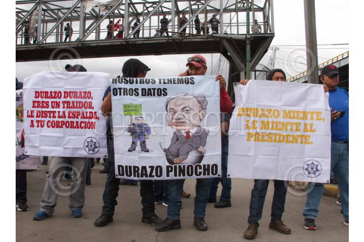 CIUDAD DE MÉXICO, 13SEPTIEMBRE2019.- Integrantes de la Policía Federal bloquearon el Circuito Interior, el cual es uno de los principales accesos al Aeropuerto Internacional de la Ciudad de México, como forma de protesta para ser indemnizados por la corporación policiaca al no aceptar ser parte de la Guardia Nacional. FOTO: ROGELIO MORALES /CUARTOSCURO.COM
