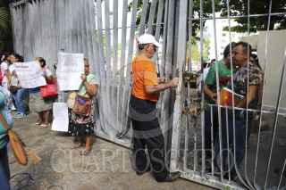 ACAPULCO, GUERRERO, 17SEPTIEMBRE2019.- Habitantes de colonias de la periferia de Acapulco tomaron de manera pacífica el ayuntamiento y pusieron cadenas con candados en el acceso principal del Palacio Municipal, para exigir que la administración se comprometa a realizar obra pública y que les llegue el suministro de agua ya que son meses que no les ha llegado ni en pipas. FOTO: BERNANDINO HERNÁNDEZ /CUARTOSCURO.COM
