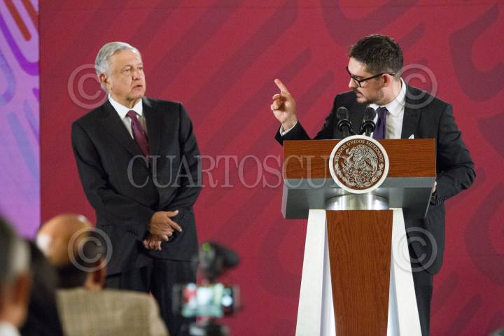 CIUDAD DE MÉXICO, 18SEPTIEMBRE2019.- Andrés Manuel López Obrador, Presidente de México, encabezo la conferencia mañanera en Palacio Nacional, lo acompañaron Arturo Herrera, secretario de Energía; David Cervantes, encargado del Plan de Reconstrucción Nacional, y Román Meter Falcón, titular de la SEDATU. FOTO: VICTORIA VALTIERRA /CUARTOSCURO.COM