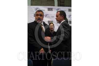 MEXICO, DF 12AGOSTO2005.- El jefe de gobierno del Distrito Federal, Alejandro Encinas y el titular de la Semarnat José Luis Luege durante la ceremonia de firma de cooperación en el palacio de mineria, son observados por la secretaria de medio ambiente del Df, Claudia Sheinbaun. FOTO:Julio Barcenas CUARTOSCURO.COM
