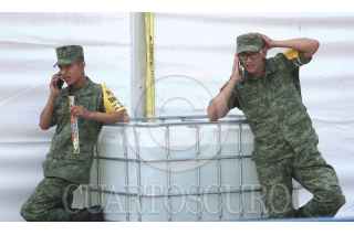 CIUDAD DE MÉXICO, 20SEPTIEMBRE2019.- Dos soldados descansan de los intensos ratos del sol de la ciudad, esto durante la inauguración de la exposición para conmemorar el " Día Nacional de Protección Civil y los sismos de 1985 y 2017", en la Plaza de la Construcción. FOTO: ROGELIO MORALES /CUARTOSCURO.COM