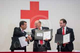 CIUDAD DE MÉXICO, 23SEPTIEMBRE2019.- José Salvador Aburto, Director General del Centro Nacional de Trasplantes; Fernando Suinaga, Presidente del Consejo Nacional de Directores de Cruz Roja Mexicana y Antonio Zermeño, Director General de la Cruz Roja, encabezaron la firma del convenio entre la Cruz Roja y el Centro Nacional de Transplantes. FOTO: ROGELIO MORALES /CUARTOSCURO.COM