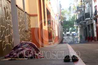 CUERNAVACA, MORELOS, 24SEPTIEMBRE2019.- Un indigente duerme envuelto en una cobija de cuadros en la acera de la calle Juan Ruíz Alarcón en el centro de la ciudad, la mañana de este día. FOTO: MARGARITO PÉREZ RETANA /CUARTOSCURO.COM