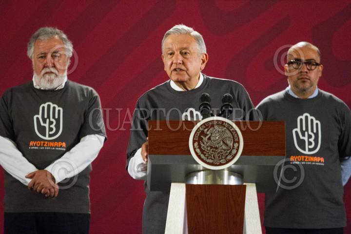 CIUDAD DE MÉXICO, 26SEPTIEMBRE2019.- Andrés Manuel López Obrador, Presidente de México; Alejandro Encinas, subsecretario de Derechos Humanos de la Segob, y Omar Gómez Trejo, titular de la Unidad Especial de Investigación y Litigación para el caso Ayotzinapa de la Fiscalía General de la República (FGR), ofrecieron una conferencia en Palacio Nacional, en la cual hablaron del estado de la investigación de la desaparición de lus 43 estudiantes de Ayotzinapa, en el marco de quinta aniversario de estos hechos. FOTO: VICTORIA VALTIERRA /CUARTOSCURO.COM