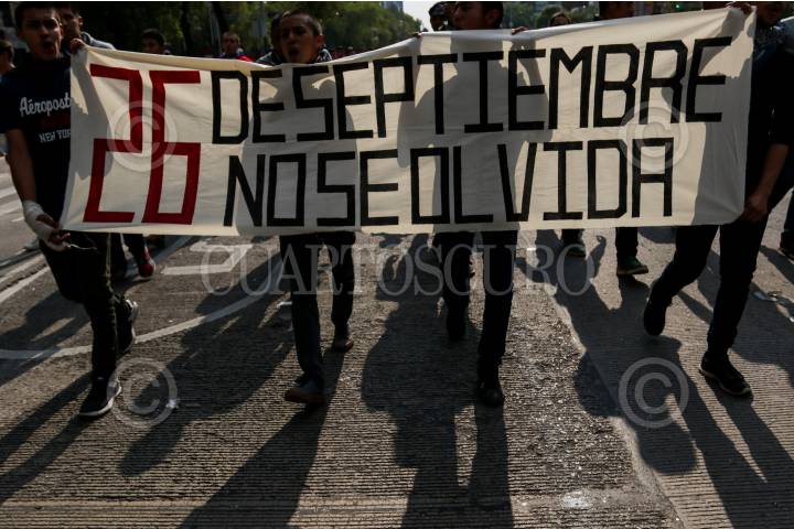 CIUDAD DE MÉXICO, 26SEPTIEMBRE2019.- Cientos de personas marcharon del Ángel de la Independencia al Zócalo capitalino a cinco años de la desaparición de los 43 normalistas de Ayotzinapa. Durante la manifestación un grupo de encapuchados realizaron pintas y ruptura de locales a su paso. FOTO: GALO CAÑAS /CUARTOSCURO.COM