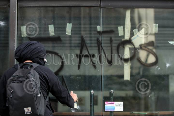 CIUDAD DE MÉXICO, 26SEPTIEMBRE2019.- Cientos de personas marcharon del Ángel de la Independencia al Zócalo capitalino a cinco años de la desaparición de los 43 normalistas de Ayotzinapa. Durante la manifestación un grupo de encapuchados realizaron pintas y ruptura de locales a su paso. FOTO: GALO CAÑAS /CUARTOSCURO.COM