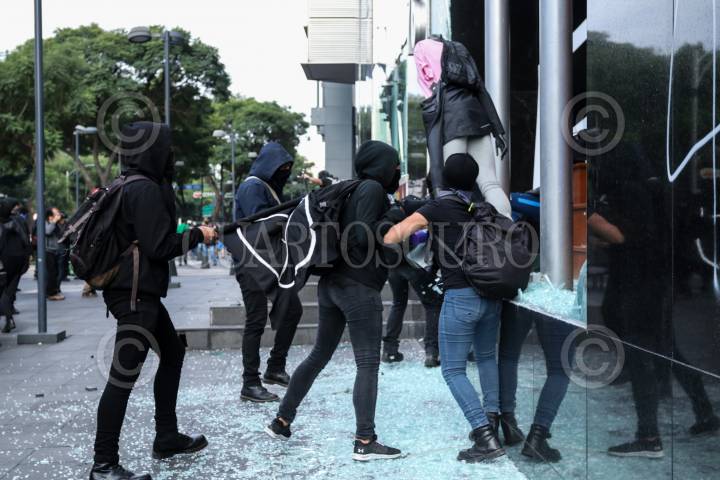 CIUDAD DE MÉXICO, 26SEPTIEMBRE2019.- Cientos de personas marcharon del Ángel de la Independencia al Zócalo capitalino a cinco años de la desaparición de los 43 normalistas de Ayotzinapa. Durante la manifestación un grupo de encapuchados realizaron pintas y ruptura de locales a su paso. FOTO: GALO CAÑAS /CUARTOSCURO.COM
