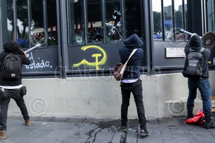 CIUDAD DE MÉXICO, 26SEPTIEMBRE2019.- Cientos de personas marcharon del Ángel de la Independencia al Zócalo capitalino a cinco años de la desaparición de los 43 normalistas de Ayotzinapa. Durante la manifestación un grupo de encapuchados realizaron pintas y ruptura de locales a su paso. FOTO: GALO CAÑAS /CUARTOSCURO.COM