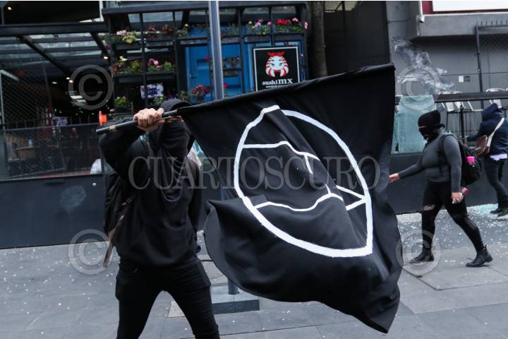 CIUDAD DE MÉXICO, 26SEPTIEMBRE2019.- Cientos de personas marcharon del Ángel de la Independencia al Zócalo capitalino a cinco años de la desaparición de los 43 normalistas de Ayotzinapa. Durante la manifestación un grupo de encapuchados realizaron pintas y ruptura de locales a su paso. FOTO: GALO CAÑAS /CUARTOSCURO.COM