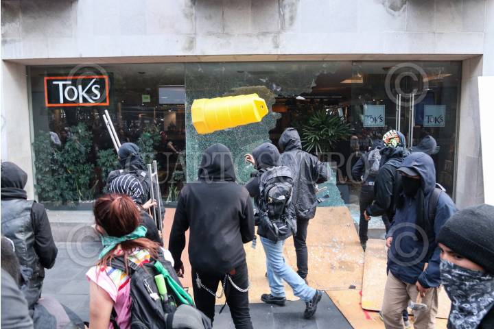 CIUDAD DE MÉXICO, 26SEPTIEMBRE2019.- Cientos de personas marcharon del Ángel de la Independencia al Zócalo capitalino a cinco años de la desaparición de los 43 normalistas de Ayotzinapa. Durante la manifestación un grupo de encapuchados realizaron pintas y ruptura de locales a su paso. FOTO: GALO CAÑAS /CUARTOSCURO.COM