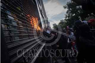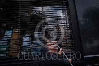 CIUDAD DE MÉXICO, 25SEPTIEMBRE2019.- Durante la marcha conmemorativa de la desaparición y comienzo de la búsqueda de los 43 estudiantes normalistas en Ayotzinapa, algunas calles del Centro Histórico de la ciudad fueron escenario de incidentes a manos de jóvenes encapuchados, algunos de ellos, autodenominado anarquistas. En la foto, jóvenes quiebran los vidrios de una famosa cadena de libros. FOTO: PEDRO ANZA /CUARTOSCURO.COM