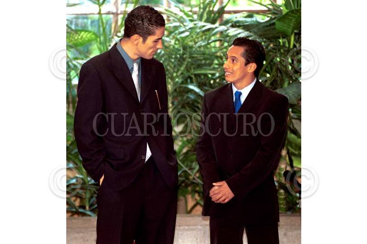 Victor Estrada y Fernando Platas conversan antes de la reunión oficial con el presidente Ernesto Zedillo en la casa presidencial. FOTO: Pedro Mera/CUARTOSCURO.COM
