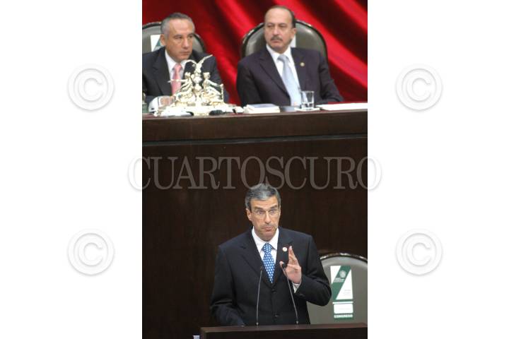 MEXICO, D.F., 01SEPTIEMBRE2005.- Miguel Espino, presidente nacional del PAN y Leonel Cota Montaño, presidente nacional del PRD, durante el V Informe de Gobierno, en la Cámara de Diputados. FOTO: Moisés Pablo/CUARTOSCURO.COM