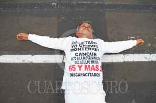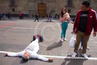 CIUDAD DE MÉXICO, 04OCTUBRE2019.- Un adulto mayor se manifiesta tendido sobre el asfalto del circuito de la Plaza de la Constitución, se manifiesta en contra de la discriminación a las personas de más de 65 años. FOTO: VICTORIA VALTIERRA /CUARTOSCURO.COM