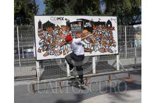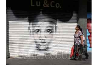 CIUDAD DE MÉXICO, 07OCTUBRE2019.- Mujer mira una corita intervenida por artista urbano en donde se puede observar el rostro de una niña. FOTO: ROGELIO MORALES /CUARTOSCURO.COM
