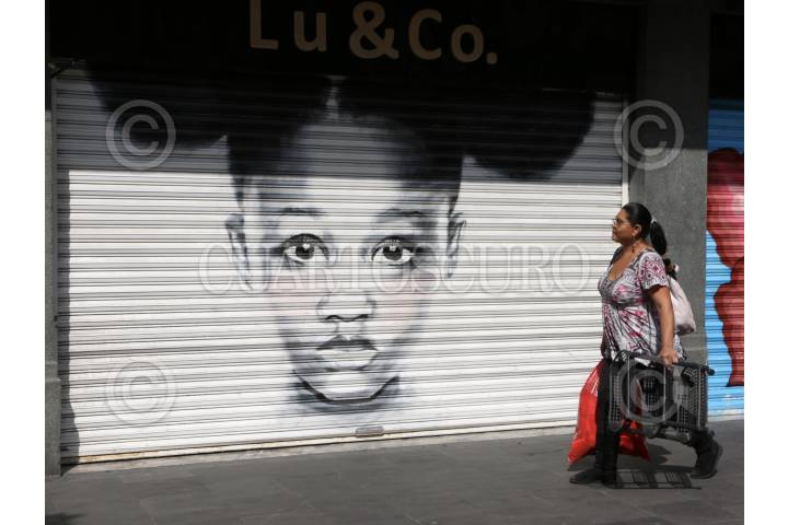 CIUDAD DE MÉXICO, 07OCTUBRE2019.- Mujer mira una corita intervenida por artista urbano en donde se puede observar el rostro de una niña. FOTO: ROGELIO MORALES /CUARTOSCURO.COM