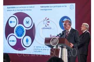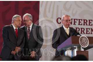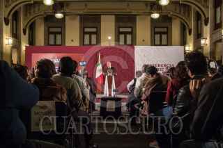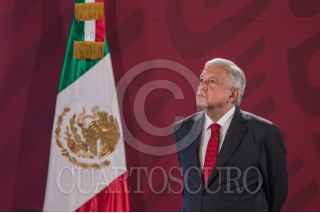 CIUDAD DE MÉXICO, 08OCTUBRE2019.- Andrés Manuel López Obrador, presidente de México, acompañado de uJavier Jiménez Espriu, Secretario de Comunicaciones y Transportes, durante la conferencia matutina a medios de comunicación en el Palacio Nacional. FOTO: ANDREA MURCIA / CUARTOSCURO.COM