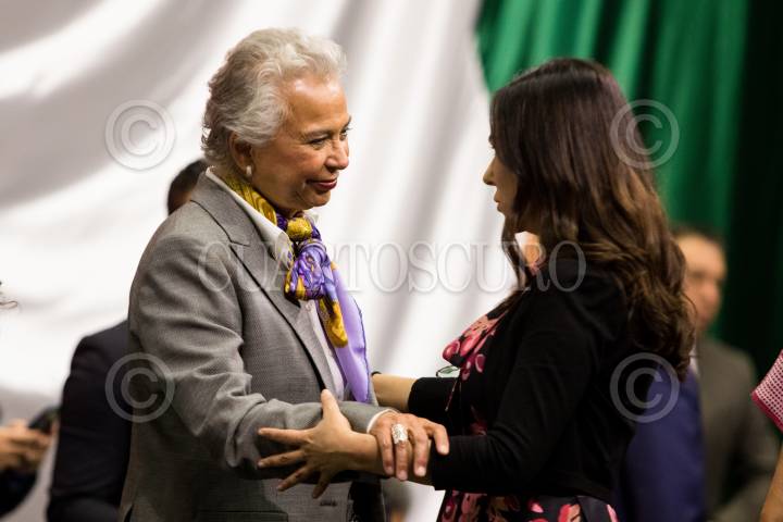CIUDAD DE MÉXICO, 09OCTUBRE2019.- Olga Sánchez Cordero, secretaria de Gobernación, compareció ante diputados federales en el marco de la Glosa del I Informe de Gobierno, fue recibida por Laura Angélica Rojas, presidenta de la mesa directiva. FOTO: MOISÉS PABLO /CUARTOSCURO.COM