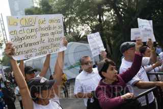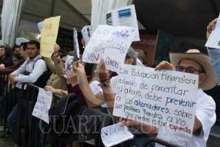 CIUDAD DE MÉXICO, 10OCTUBRE2019.- Defraudados por instituciones financieras privadas como Ficrea se manifestaron durante la inauguración de la Semana Nacional de Educación Financiera, a la cual estaba invitado el titular de la Comisión Nacional Bancaria y de Valores, a quien señalan de omisa al no regular y advertir de este tipo de empresas que ofrecen jugosas ganancias en sus inversiones y que de la noche a la mañana desaparecen sin que nadie les de razón del dinero invertido. FOTO: MOISÉS PABLO /CUARTOSCURO.COM