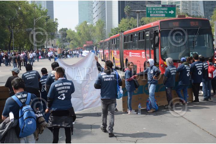 CIUDAD DE MÉXICO, 10OCTUBRE2019.- Integrantes de la "Organización de Recicladores Unidos por el Derecho al Trabajo", quienes se encargan de recolectar desechos como pet, latas, cartón y otros materiales renovables, bloquean las inmediaciones del Senado de la República luego de marcha desde el Zócalo a la zona de Paseo de la Reforma en la Ciudad de México, en contra de una iniciativa que promueve el PVEM para privatizar la recolección de basura. Por lo anterior el paso de la Línea 1 del Metrobús se vio afectado , provocando que sus usuarios fueran desalojados de las unidades y continuarán su camino a pie. FOTO: ARMANDO MONROY /CUARTOSCURO.COM