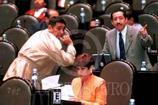 El legislador perredista Felix salgado Macedonio conversa con uno del PRI en la sesión de la Cámara baja, esta tarde. FOTO: Christian Palma/CUARTOSCURO.COM