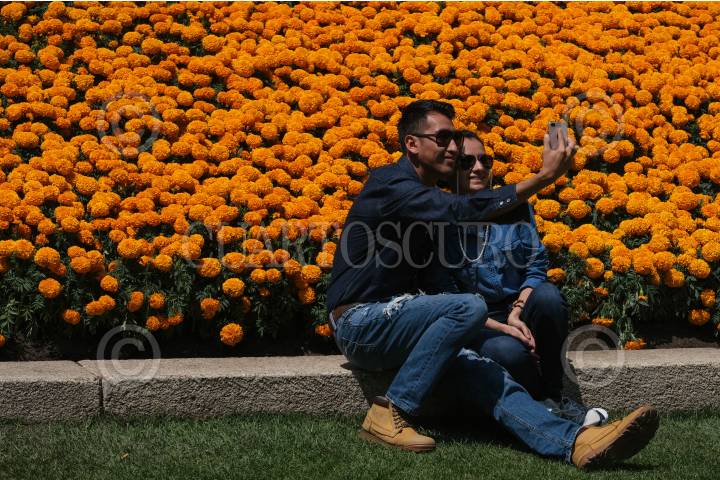 CIUDAD DE MÉXICO, 13OCTUBRE2019.- Una pareja se toma una selfie en las flores de cempasúchil que se encuentran en sobre Paseo de la Reforma. FOTO: GRACIELA LÓPEZ /CUARTOSCURO.COM