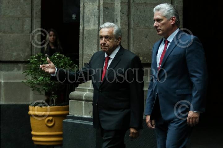 CIUDAD DE MÉXICO, 17OCTUBRE2019.- Miguel Díaz-Canel, presidente de Cuba; Andrés Manuel López Obrador, presidente de México, y Beatriz Gutiérrez Müller, presidenta honoraria de la Coordinación de Memoria Histórica y Cultural de México y primera dama mexicana, durante la ceremonia de bienvenida al mandatario cubano. FOTO: GALO CAÑAS /CUARTOSCURO.COM