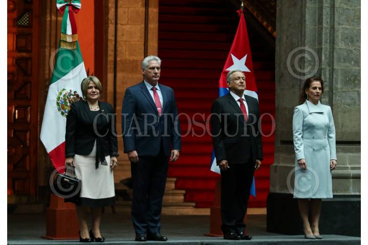CIUDAD DE MÉXICO, 17OCTUBRE2019.- Miguel Díaz-Canel, presidente de Cuba; Andrés Manuel López Obrador, presidente de México, y Beatriz Gutiérrez Müller, presidenta honoraria de la Coordinación de Memoria Histórica y Cultural de México y primera dama mexicana, durante la ceremonia de bienvenida al mandatario cubano. FOTO: GALO CAÑAS /CUARTOSCURO.COM