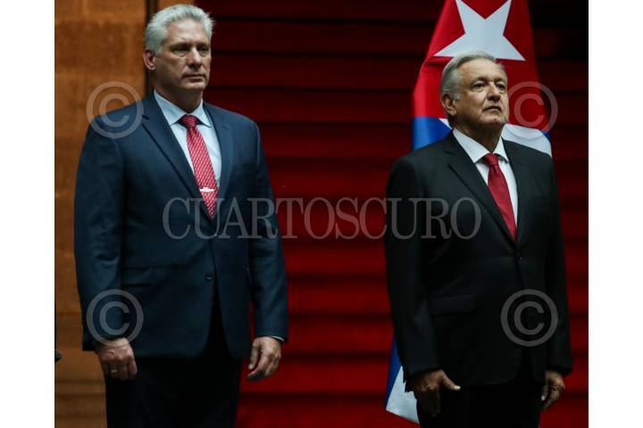 CIUDAD DE MÉXICO, 17OCTUBRE2019.- Miguel Díaz-Canel, presidente de Cuba; Andrés Manuel López Obrador, presidente de México, y Beatriz Gutiérrez Müller, presidenta honoraria de la Coordinación de Memoria Histórica y Cultural de México y primera dama mexicana, durante la ceremonia de bienvenida al mandatario cubano. FOTO: GALO CAÑAS /CUARTOSCURO.COM
