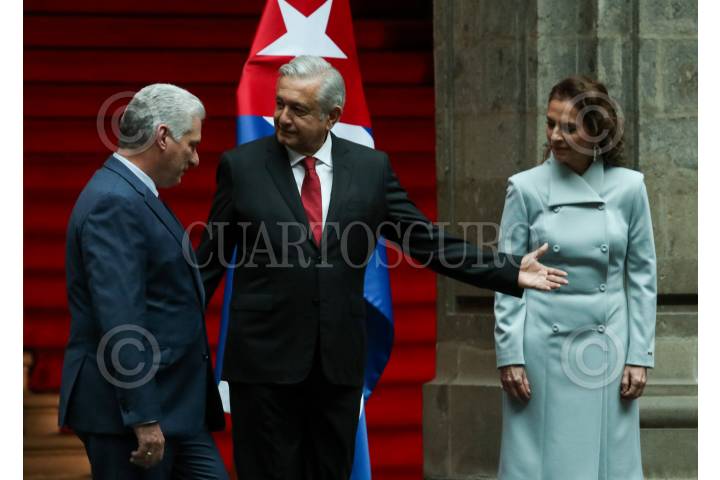 CIUDAD DE MÉXICO, 17OCTUBRE2019.- Miguel Díaz-Canel, presidente de Cuba; Andrés Manuel López Obrador, presidente de México, y Beatriz Gutiérrez Müller, presidenta honoraria de la Coordinación de Memoria Histórica y Cultural de México y primera dama mexicana, durante la ceremonia de bienvenida al mandatario cubano. FOTO: GALO CAÑAS /CUARTOSCURO.COM