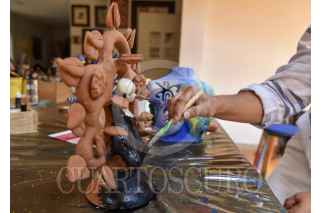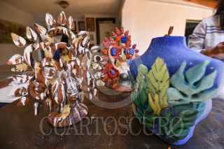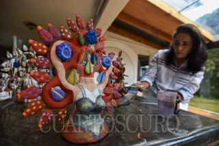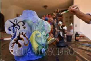 METEPEC, ESTADO DE MÉXICO, 18OCTUBRE2019.- María del Carmen Castrejón, artista plástica y promotora de la cultura y salud, inició hace 10 años el proyecto llamado Teterías, que busca informar a las mujeres acerca del Cáncer de Mama; a través del arte, de la educación y la sensibilización a hombres y mujeres, intervienen bustos de barro que posteriormente son expuestos y se recaudan fondos que van a organizaciones o fundaciones, o de forma directa dan prótesis externas, mangas para linfedema, brasieres para mujeres que no tienen uno o ambos senos, y realizan un foro o platica que hable sobre este padecimiento. FOTO: CRISANTA ESPINOSA AGUILAR /CUARTOSCURO.COM